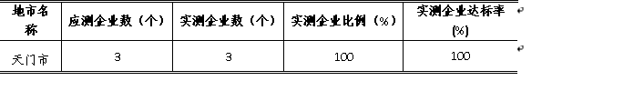 地市名称 | 应测企业数(个) | 实测企业数(个) | 实测企业比例(%) | 实测企业达标率(%) | 实测排放口数(个) | 实测排放口达标率(%) |