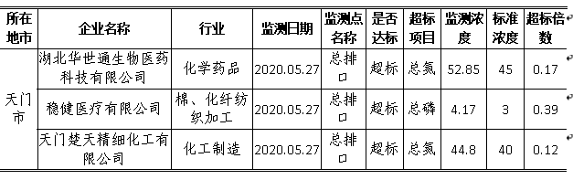 重点排污单位中,除稳健医疗有限公司总磷超标、天门楚天精细化工有限公司和湖北华世通生物医药科技有限公司总氮超标外,其他企业排放均达标。具体见附表3:天门市2020年上半年度废水重点企业超标明细表以及附表6:天门市2020年上半年度监测企业监测数据审核表。